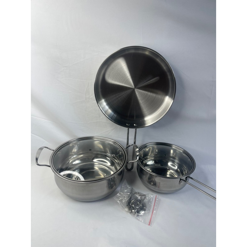 Material : Stainless Steel Dimensi approx : Milk pan : 18 x 18 x 8 cm Stock pot : 22 x 22 x 9 cm Frying pan : 23 x 23 x 4 cm