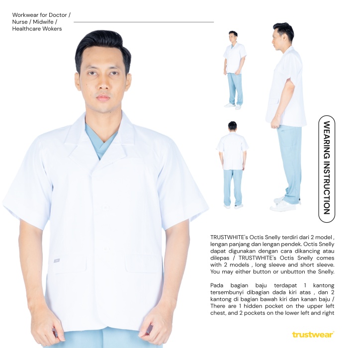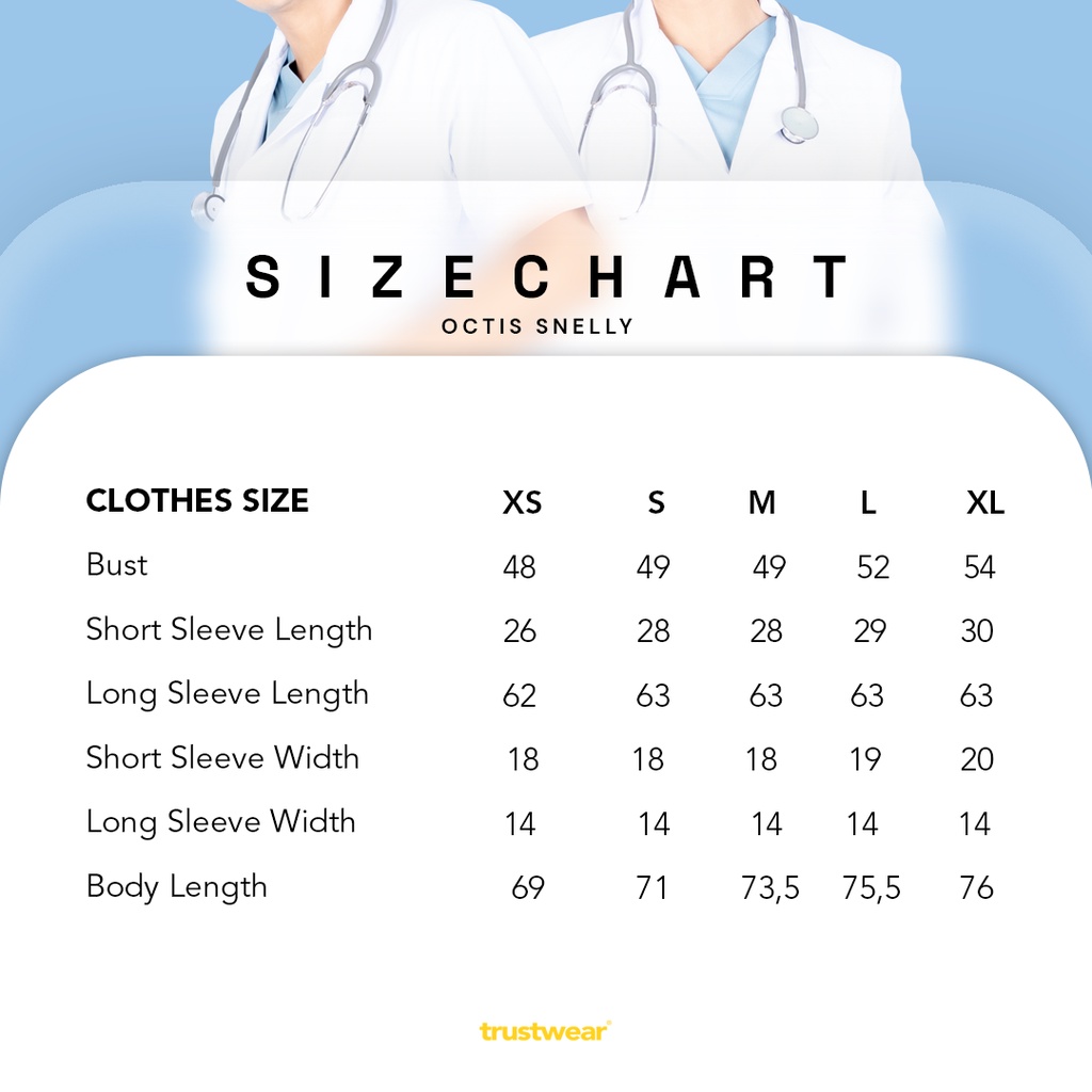 I. Deskripsi produk: Produk: Octis Snelly/Jas Dokter (Snelli) Bahan: Medic White Model : Lengan Panjang dan Lengan Pendek Size: Size chart yang tercantum pada slide ke-3 foto produk merupakan size pakaian yang sesungguhnya (toleransi perbedaan size +/-3 cm), bukan size tubuh pengguna.