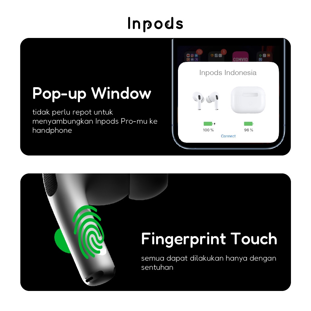 Nama Produk : Inpods Pro Versi Bluetooth : 5.0 Jarak Bluetooth : Max 10 meter Frekuensi : 2.4 - 2.48 GHz Waktu Pemakian :up to 3-4 Jam Kapasitas Baterai Case : 210 Mah (Upto 5x Charge) Waktu Charging : 1 Jam Sertifikasi IP67