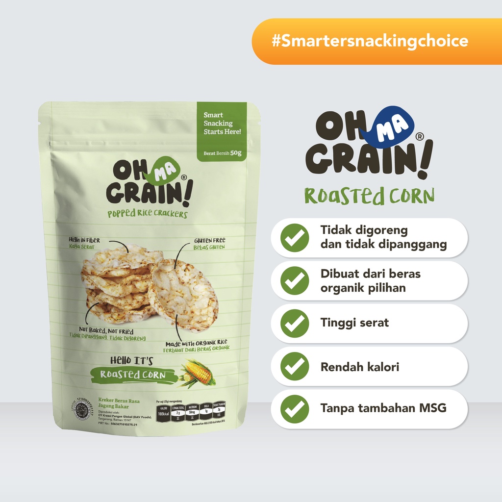 Oh Ma Grain adalah snack beras yang terbuat dari campuran beras cokelat dan beras putih organik. Proses pembuatannya tidak dipanggang, tidak digoreng, tapi menggunakan popping technology. - Dibuat dari beras organik pilihan (kaya akan serat) - No MSG - Gluten Free - Tanpa 3P (Pengawet, Perasa, dan Pewarna buatan) - No Trans Fat - Cholesterol Free - Halal