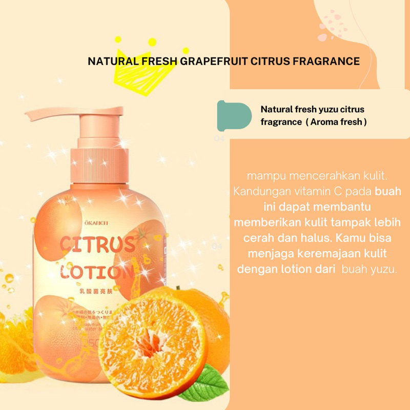 BODY LOTION 250 ML dengan aroma yg harum terbuat dr bahan alami buah peach dan buah yuzu ( bebas alkohol, bebas bahan pengawet, bebas perwana )