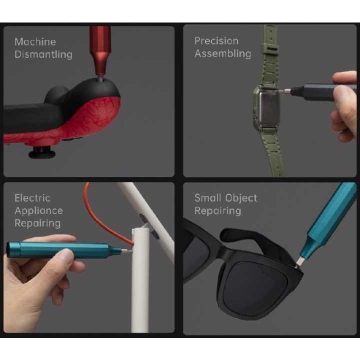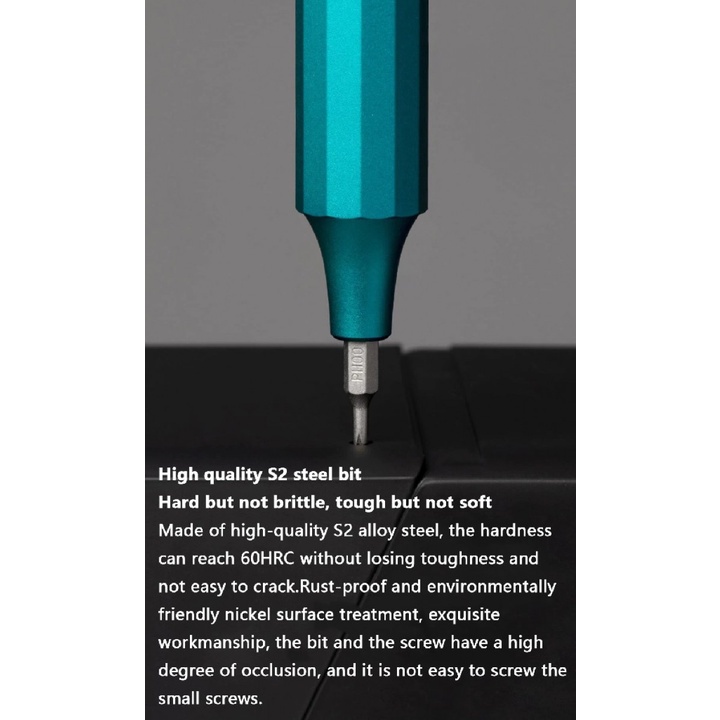 Desainnya sangat portabel dengan bagian body menggunakan material Aluminium Alloy dan mata obeng terbuat dari S2 Stainless Steel. Tidak perlu kerepotan membawa semua mata obeng tersebut karena pada gagangnya terdapat slot untuk menyimpan semua mata obeng tersebut dengan fitur Magnetic sehingga tidak mudah terjatuh dan hilang.