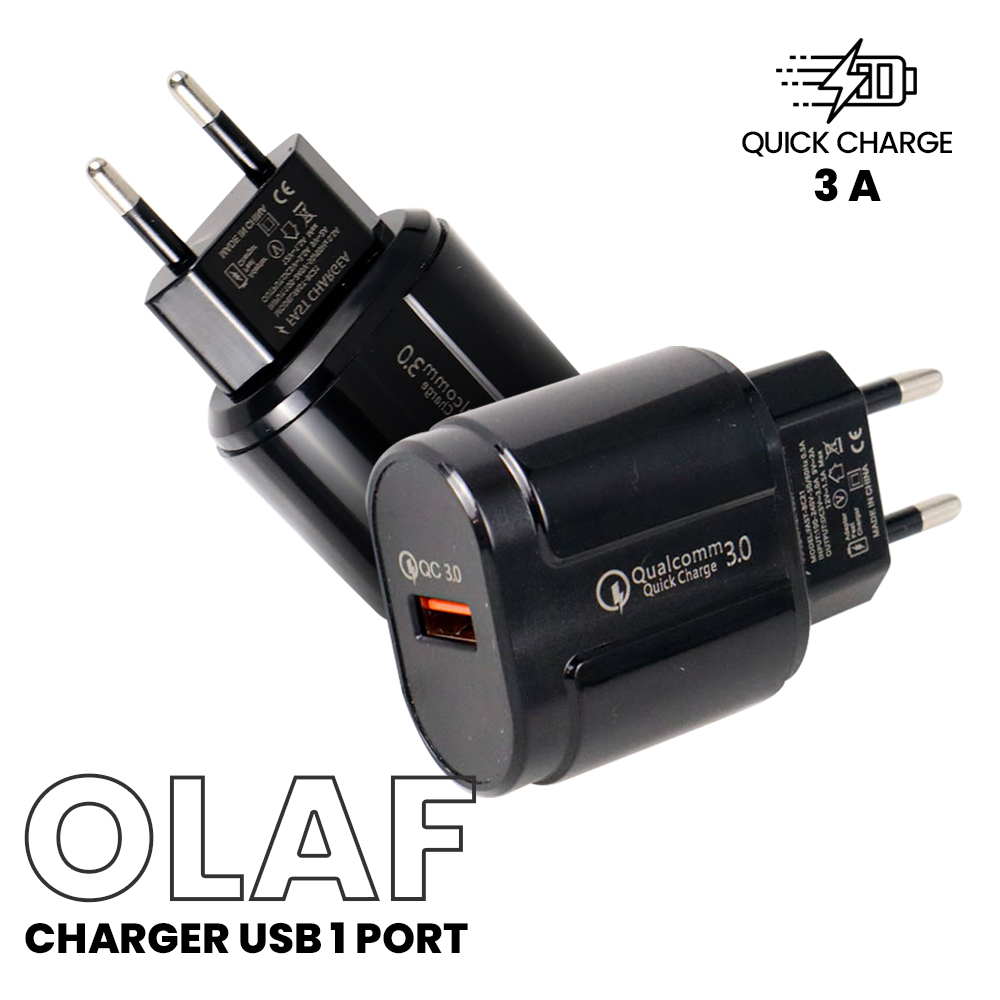 Charger Olaf adalah charger USB untuk berbagai macam gadget Anda. Hadir dengan soket plug EU yang umum digunakan di Indonesia. Memiliki voltase output 3 A sehingga pengisian daya menjadi lebih efektif. Charger ini juga sudah dibekali dengan teknologi Quick Charge 3.0.