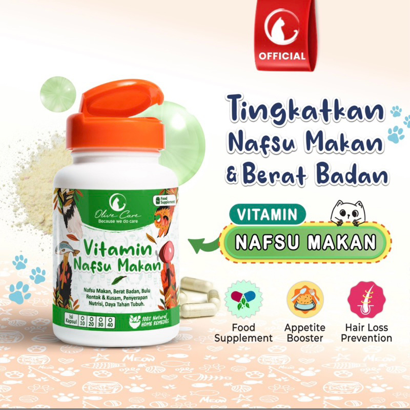 Olive Care Vitamin Nafsu Makan isi 10 kapsul, untuk bantu meningkatkan nafsu makan, mencegah bulu rontok, dan menggemukkan kucing dengan memaksimalkan penyerapan nutrisi.