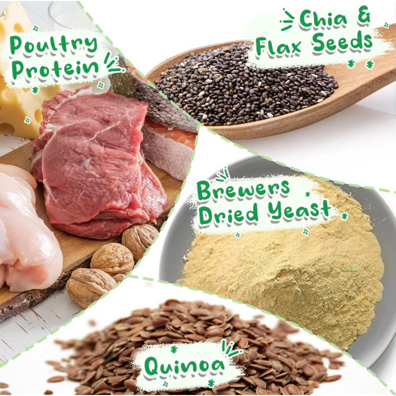 Dengan 6 bahan utama yang dimport langsung dari California, USA: - Chia Seeds • Flax Seeds • Quinoa -L-Lysine -Poultry Protein -Brewers Dried