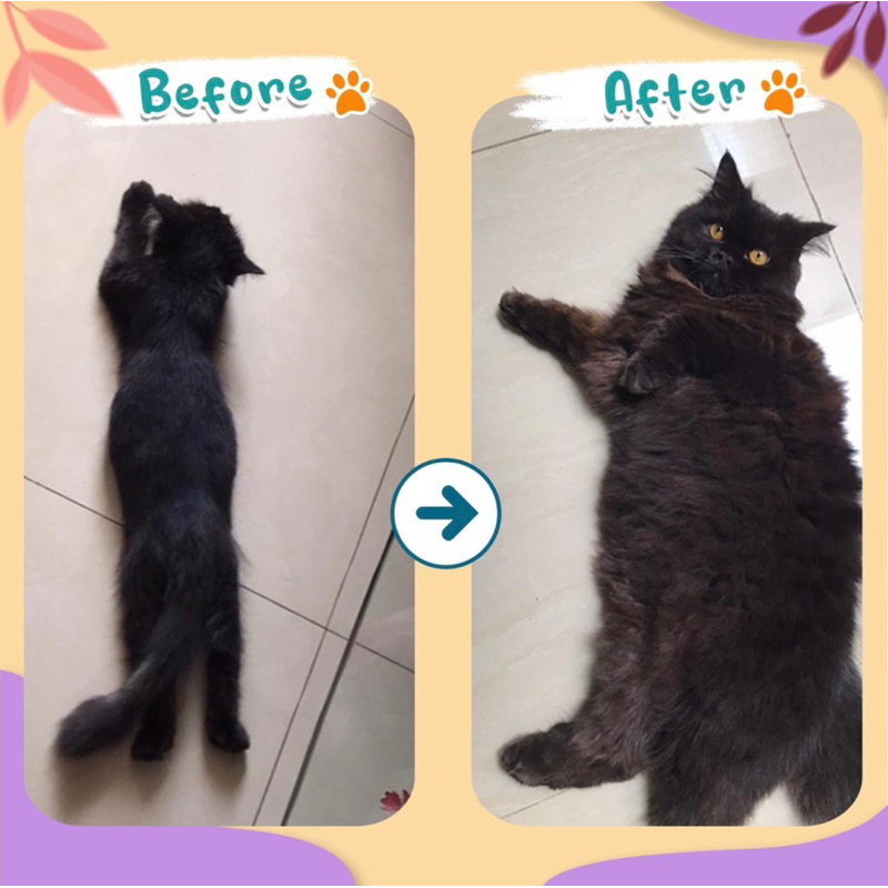 Manfaat Vitamin dapat terlihat dalam 7 hari pada kucing kamu: 1. Nafsu makan meningkat 2. Berat badan bertambah 3. Bulu rontok berkurang dan lebih halus 4. BAB menjadi lancar 5. Lebih sehat dan tidak mudah sakit