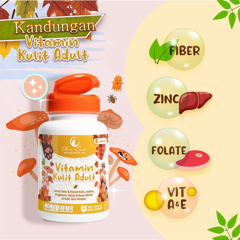 Olive Care Vitamin Kulit Adult isi 10 - 50 kapsul, untuk meningkatkan kekebalan tubuh, menambah stamina, dan mendorong antibody kucing untuk selalu aktif melawan bakteri dan virus penyebab penyakit kulit.
