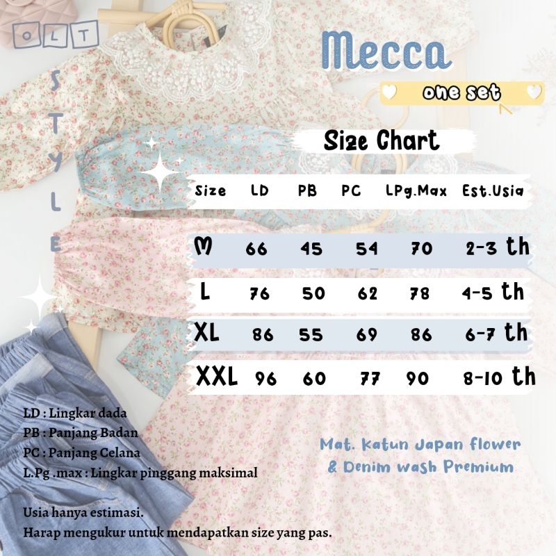 New collection ^ONE Set MECCA^ . Oneset by OLT style dengan desain terbaru yang supeer cantik bangeet 😍 Cek detail model yuu : ✨️ . One set kombinasi motif flower dan celana bahan denim wash premium yang bahannya lemes dan lembut banget di nyaman dipakai si kecil 🤗 . Readi 3 warna cantik . Detail : - Atasan Cotton bunga premium - Kombinasi cantik perpaduan renda import di keliling leher - Model tangan puffy kekinian - Bagian belakang menggunakan kancing jadi lebih nyaman dipakai pastinya - Cutting atasan flowy - Jahitan rapi
