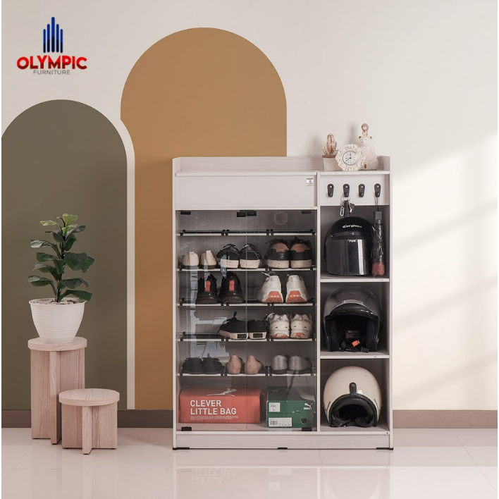 Keunggulan : + Lemari rak sepatu dengan 6 susun rak penyimpanan dengan pintu kaca + DIlengkapi 3 rak penyimpanan dengan luas area lebih besar + Dilengkapi lemari / rak penyimpanan tertutup pada bagian atas lemari + Dilengkapi gantungan kunci di bagian depan + Terdapat 2 pilihan warna : putih / cream kombinasi putih
