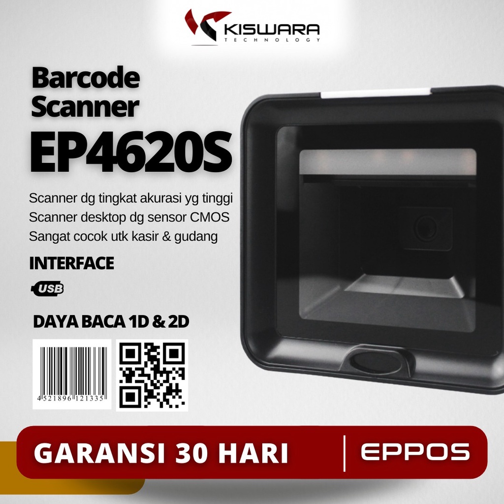 Omni Barcode Scanner EPPOS 1D/2D EP4620S [CMOS] merupakan barcode scanner dengan bentuk desktop (bukan barcode scanner hand-held atau barcocode scanner yang bisa dipegang tangan). Memiliki tingkat akurasi dan kehandalan tinggi, desain elegan dan ergonomis. Harganya eknonomis tapi kemampuan dan kualitas setara dengan produk yang telah ada di pasaran seperti barcode scanner Honeywell, barcode scanner Metrologic, dan barcode scanner lainnya