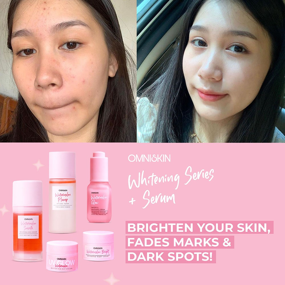 Produk Omniskin Watermelon Series UV Glow Watermelon Whitening Day Cream Produk ini merupakan krim pagi yang sudah dilengkapi dengan tabir surya. Sehingga tak hanya bisa kamu jadikan sebagai Daily Moisturizer saja, tetapi juga bisa sebagai Sunscreen/ Sunblock yang terasa ringan dan tidak membuat wajah berminyak.