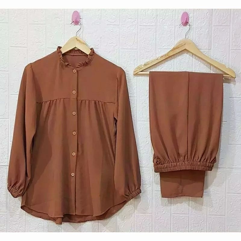 Bagian atasan mengguna kerah & menggunakan kancing dari atas sampe bawah, dibagian depan atasan juga ada saku pas bagian dada, dibagian celana juga ada sakunya kak & baju ini cocok untuk juga untuk yang menyusui juga yah kaK..