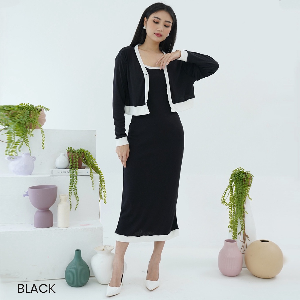 Details : atasan dengan pepaduan bahan Rib Knit dengan Outer dan dress dengan detail kancing di bagian cardigan di bagian depan Material : Rib Knit Tolerasnsi ukuran : 1-2 cm Panjang Outer : 42 cm Lingkar Dada Outer : 96 - 100 cm Panjang Tangan Outer : 54 cm Panjang Dress : 109 cm Lingkar Dada Dress : 70 - 74 cm Linggar Pinggang Dress : 62 - 66 cm Berat : 510gr