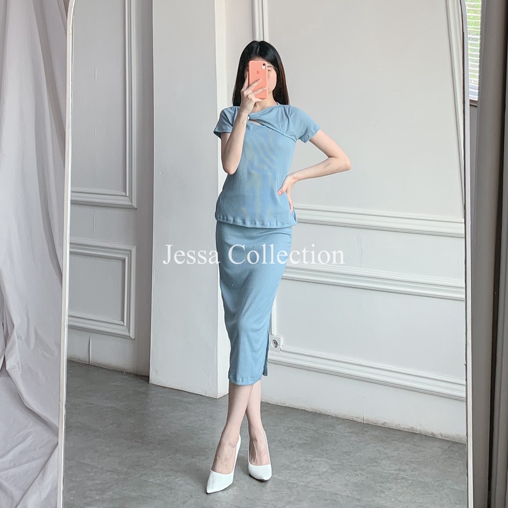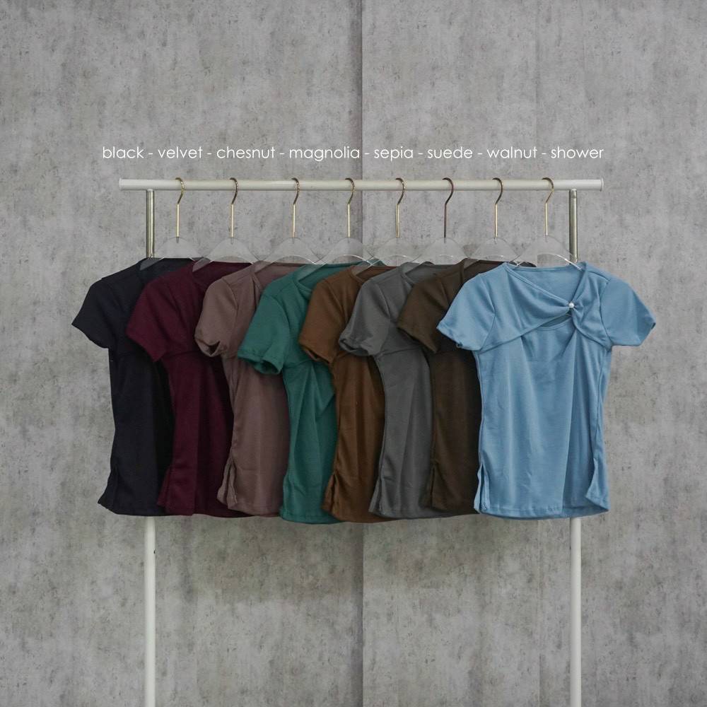 One Set Knit Monic IDR 78,000 Available in Black, Velvet, Chesnut, Magnolia, Sepia, Suede, Walnut and Shower Material : Rib Knit Top LD : 72cm (masih bisa stretch) Length : 55cm