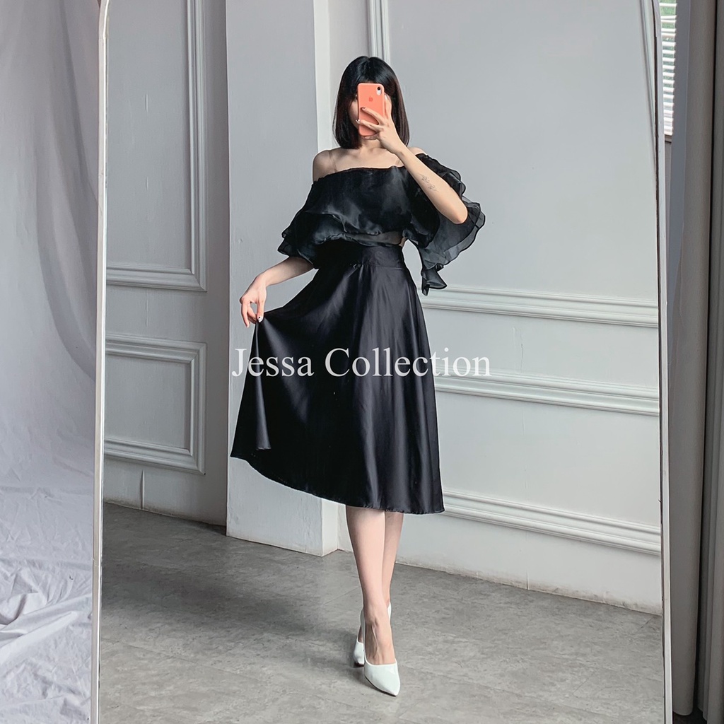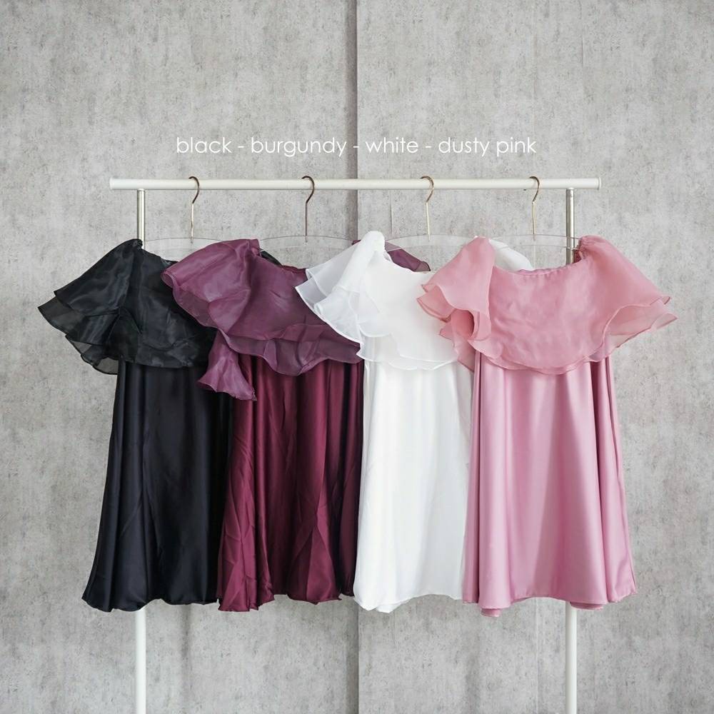 One Set Organza Doja IDR 147,000 Available in Black, Burgundy, White and Dusty Pink Material : Satin Silk + Organza Top LD : 74-88cm Length : 26cm (dari bagian dada)