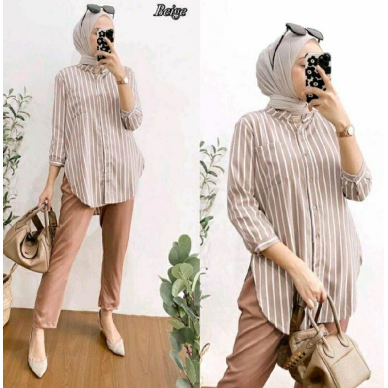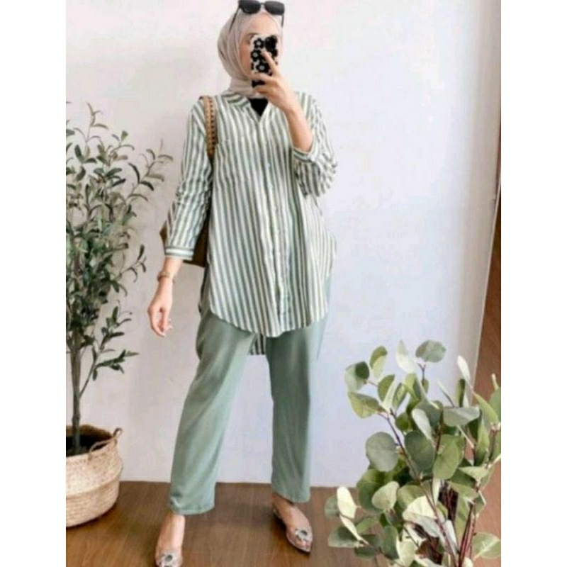 Detail One Set Salur | One Set Kemeja Wanita Garis Salur trend Kekinian