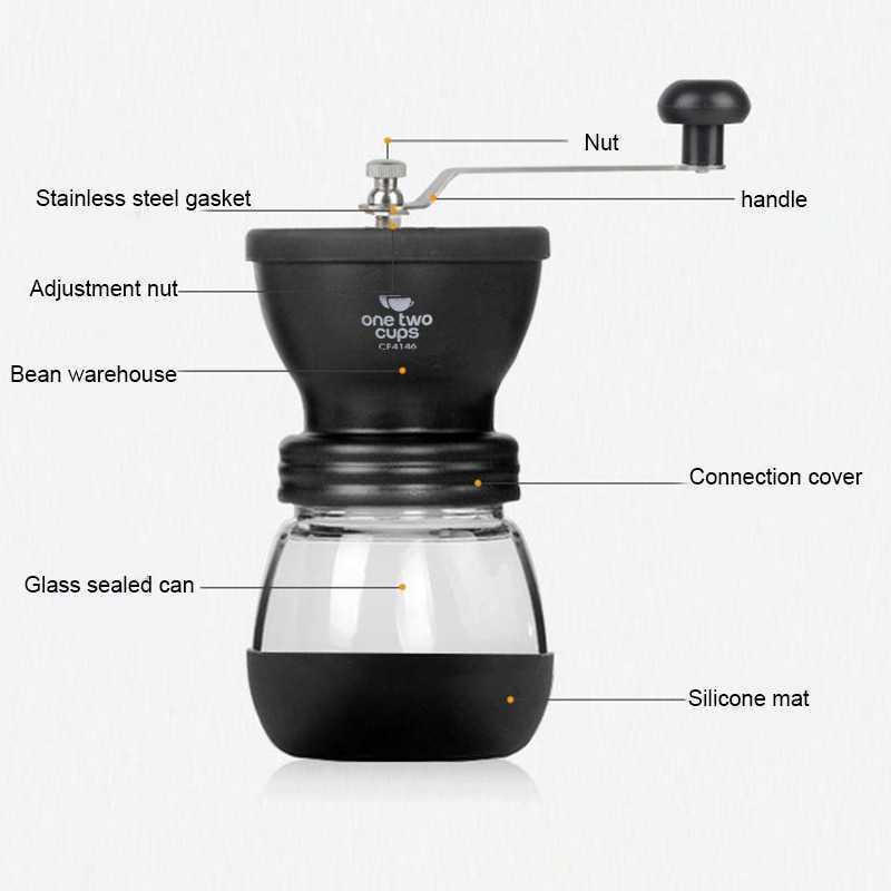 Spesifikasi One Two Cups Alat Penggiling Kopi Manual Coffee Grinder - CF4146 Material : Toples: Kaca, Silikon dan ABS