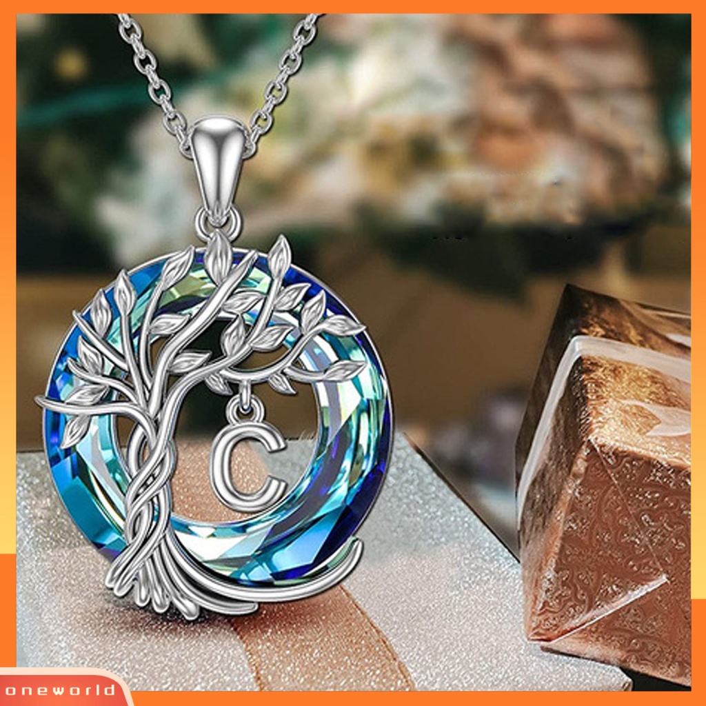 [ONE] Wanita Kalung Hollowed-out Imitasi Lingkaran Kristal Silver Disepuh A-Z Huruf Inisial Pohon Kehidupan Kalung Rantai Untuk Pacaran