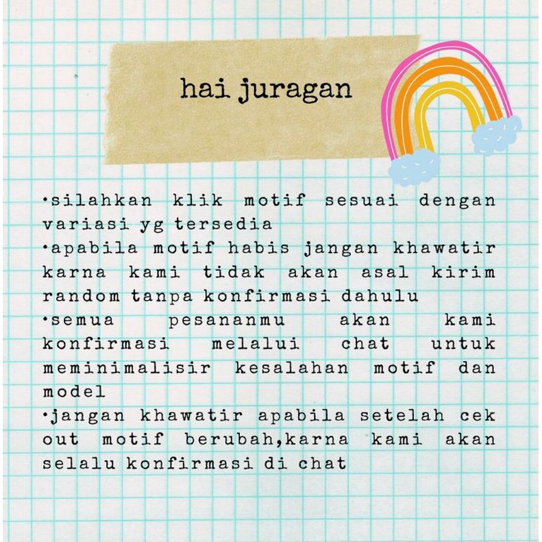 -screenshoot motif yg dimau -kirim motif dichat -jangan salah pilih model produk karna kesalahan saat cek out diluar tanggung jawab kami