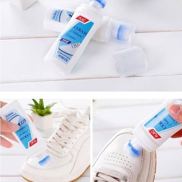 Isi : 100 ml Jenis : Semir Sepatu khusus untuk yang berwarna putih Kegunaan : - Membersihkan sepatu/ barang kulit yang kotor - Memutihkan sepatu yang menguning - Dapat digunakan untuk membersihkan tas dan semua jenis barang kulit.