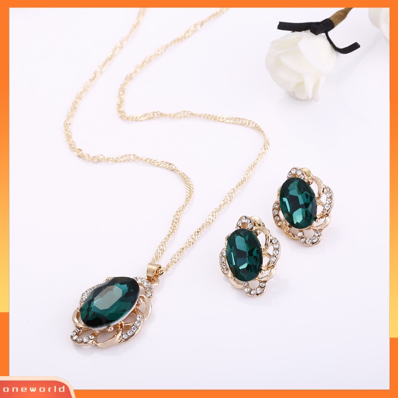 Detail [ONR] Set Anting Kalung Belah Ketupat Kristal Kombinasi Anting Liontin Perhiasan Set