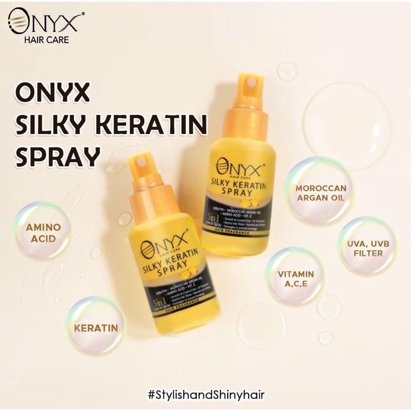 Onyx Silky Keratin Spray diformulasikan dengan Keratin & Moroccan Argan Oil yang memberi nutrisi pada rambut Anda. Dengan 5 manfaat dalam 1 produk yaitu :
