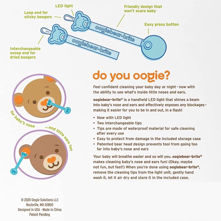 Oogiebear Clean Your Baby's Nose And Ears Alat Pembersih Bayi merupakan pembersih lendir hidung dan telinga yang dapat digunakan pada bayi Anda sehingga Sikecil dapat bernafas dengan lega. Pembersih ini mudah untuk digunakan dan dibawa saat berpergian, hanya dengan menekan pompa, serta mendekatkan ujung pipa ke hidung Si kecil. Pembersih ini dilengkapi dengan fitur loop end (untuk sticky mucus), scoop end (untuk dried mucus) dan memiliki soft rubber coating yang lembut untuk kulit bayi, serta terbuat dari bahan latex-,BPA-, & PVC- free, sehingga aman untuk digunakan.