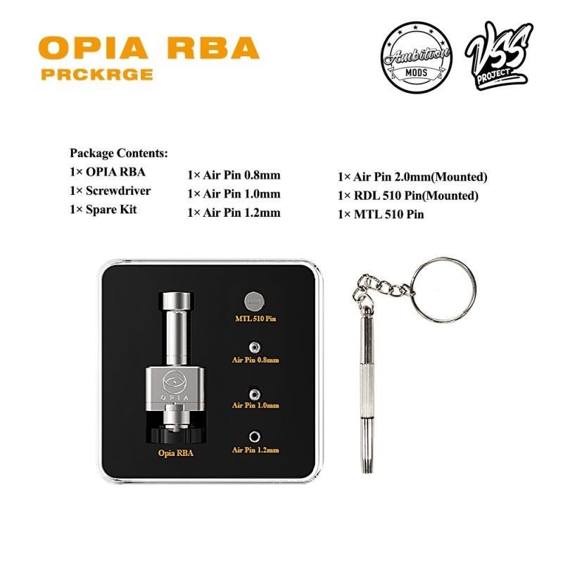 Includes : 1x Authentic Ambition Mods Opia RBA 1x Air Pin 0.8mm 1x Air Pin 2.0mm (Mounted) 1x Screwdriver 1x Air Pin 1.0mm 1x RDL 510 Pin (Mounted) 1x Spare Kit 1x Air Pin 1.2mm 1x MTL 510 Pin