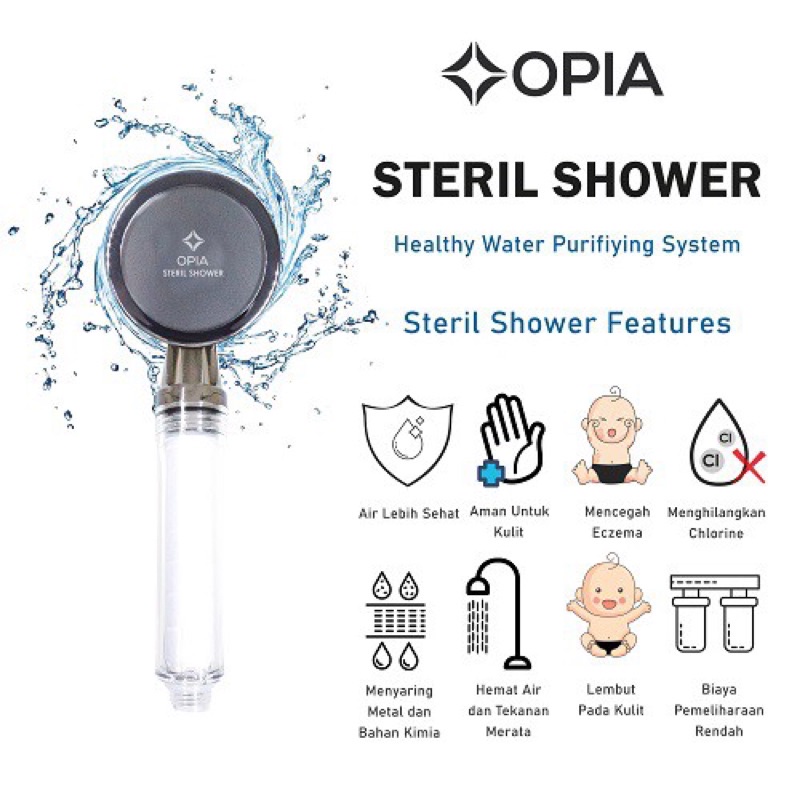 Opia Steril Shower adalah filter air dengan daya pemurnian tinggi yang memiliki Sertifikat dan Tes Lab Efektif menghilangkan partikel kotoran, bahan kimia berbahaya serta menghilangkan kandungan Chlorine pada air. Semua kontaminan ini ada dalam air biarpun air terlihat jernih dan tidak terlihat kasat mata. Hal ini dapat berdampak negatif, terlebih pada bayi yang memiliki kulit yang sensitif.