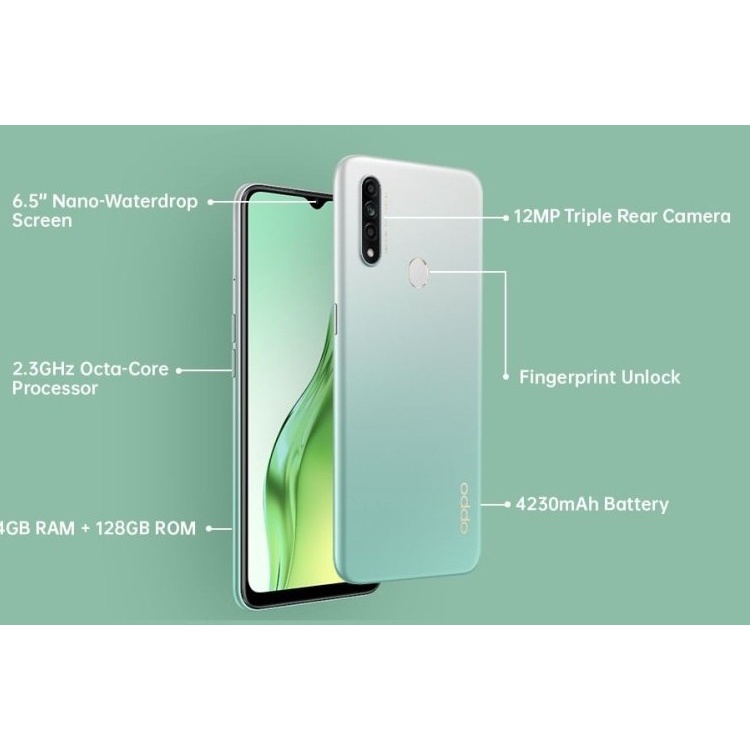 UMUM Jaringan 2G, 3G, 4G SIM Card Dual SIM (Slot Khusus) eSIM Tidak BODY Dimensi 163.9 x 75.5 x 8.3 mm Berat 180 gram Ketahanan - Fitur Lainnya - LAYAR Jenis IPS LCD Ukuran 6.5 inci Refresh Rate 60 Hz Resolusi 720 x 1600 piksel Rasio 20:9 Kerapatan 270 ppi Proteksi Corning Gorilla Glass 3 Fitur Lainnya Tingkat kecerahan khas 480 nit HARDWARE Chipset MediaTek Helio P35 CPU Octa-core (4x2.3 GHz Cortex-A53 & 4x1.8 GHz Cortex-A53) GPU PowerVR GE8320 MEMORI RAM 4 GB Memori Internal 64 GB, 128 GB Memori Eksternal Ada (Slot Khusus) KAMERA UTAMA Jumlah Kamera 3 Konfigurasi 12 MP (wide), f/1.8 2 MP (macro), f/2.4 2 MP (depth), f/2.4 Fitur PDAF, LED flash, HDR, panorama, Video: 1080@30/60 fps KAMERA DEPAN Jumlah Kamera 1 Konfigurasi 8 MP (wide), f/2.0 Fitur HDR, Video: 1080@30fps KONEKTIVITAS WLan Wi-Fi 802.11 a/b/g/n/ac, dual-band, Wi-Fi Direct, hotspot Bluetooth 5.0, A2DP, LE Infrared Tidak Ada NFC Tidak Ada GPS GPS, A-GPS, GLONASS, BDS USB microUSB 2.0, USB On-The-Go BATERAI Jenis Li-Po Kapasitas 4230 mAh Fitur - FITUR OS (Saat Rilis) Android 9.0 (Pie), ColorOS 6.1 Sensor Sidik jari (belakang), akselerometer, cahaya, giroskop, proksimitas, kompas Jack 3.5mm Ada Warna Fantasy White, Mystery Black Fitur Lainnya Radio FM