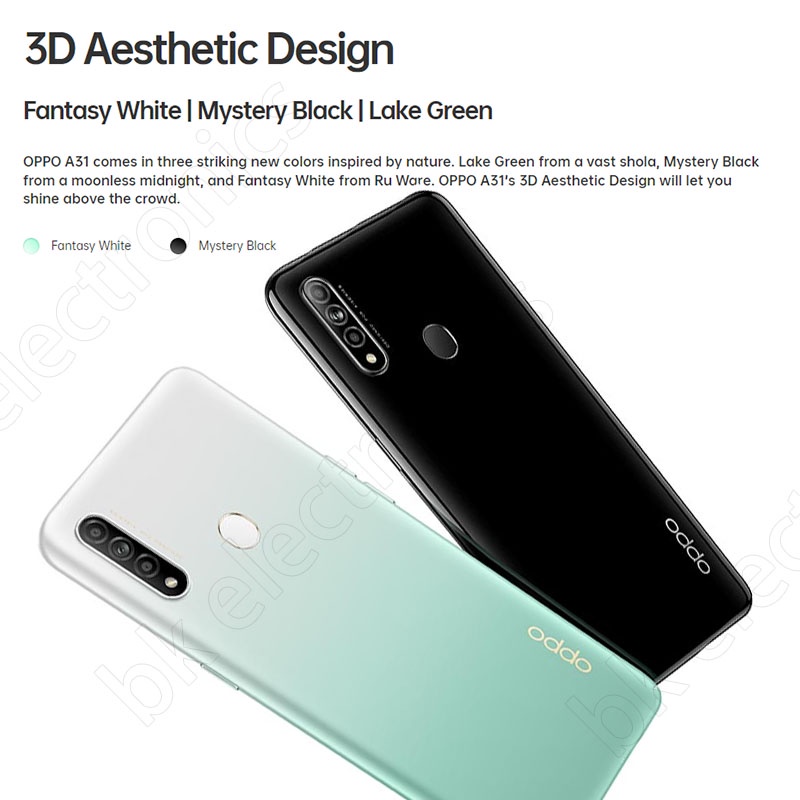 ★★★★★★★★★★★★★★★★★★★★★★★★ specification Merek:Oppo Model:A31 Warna:Danau Hijau, Merah, Hitam Faktor bentuk:Layar sentuh Dimensi (mm):163,90 x 75,50 x 8,30 Ukuran layar (inci):6,50 Resolusi:720x1600 piksel Berat (g):180.00 Kapasitas baterai (mAh):4230 Layar sentuh:Ya Rasio aspek:20:9 Prosesor:(4x2.3GHz+ 4x1.8 GHz ) octa-core Prosesor membuat:MediaTek MT6765 Helio P35 RAM:6GB ROM:128GB Penyimpanan yang dapat diperluas:Ya Jenis penyimpanan yang dapat diperluas:microSD Penyimpanan yang dapat diperluas hingga:(GB) 256