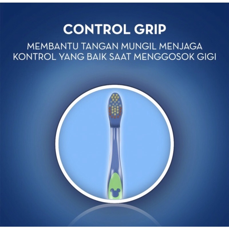 Control Grip: Membantu tangan mungil menjaga kontrol yang baik saat menggosok gigi. Penstabil pegangan: Membantu menjaga sikat tetap stabil saat diletakkan.