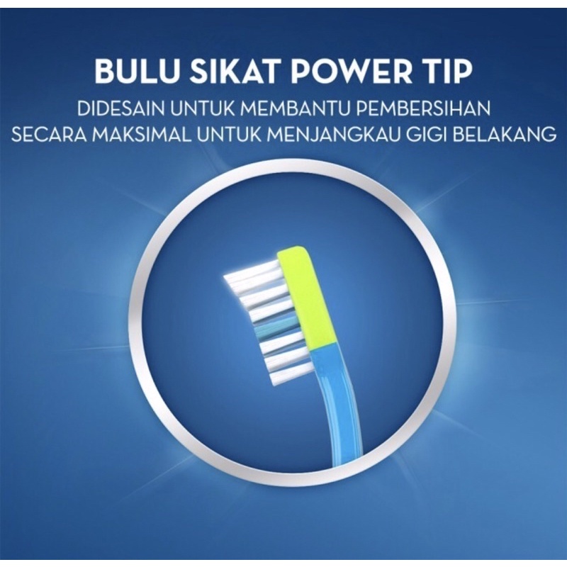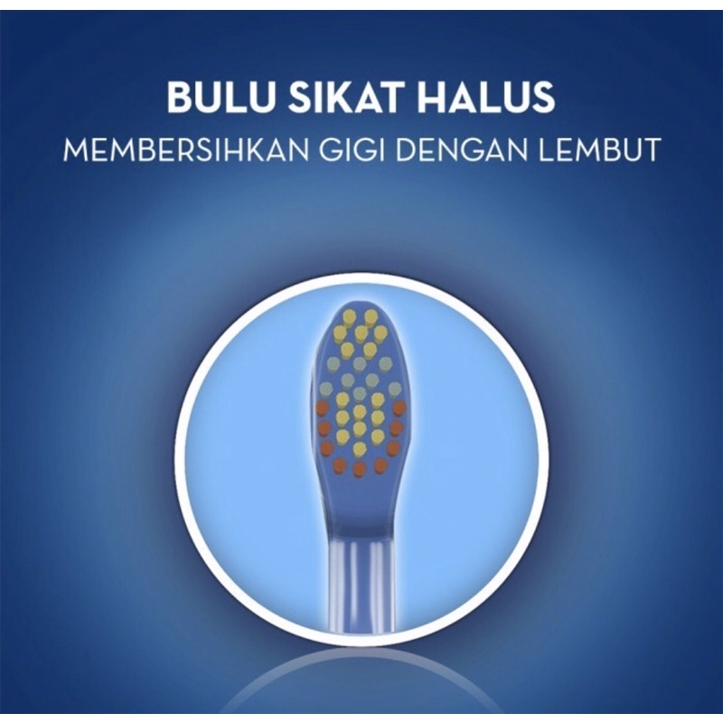 Bulu Sikat Power Tip: Didesain untuk membantu pembersihan secara maksimal untuk menjangkau gigi belakang. Bulu sikat indikator warna biru: Akan memudar setelah digunakan separuh jalan sehingga Anda tahu kapan harus mengganti sikat gigi anak Anda.