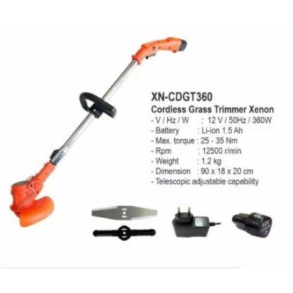Spesifikasi Mesin : Brand : ORANGE SKU : 6206 CORDLESS GRASS TRIMMER Spesifikasi Produk : Jenis Baterai : LI-ion 12V, 1.500 mAh Daya listrik : 360 Watt Kecepatan tanpa beban : 12.500 rpm