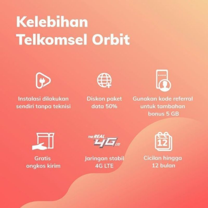 Syarat & Ketentuan pembelian modem Telkomsel Orbit Pro: 1. Setiap pembelian modem Telkomsel Orbit Max akan langsung mendapatkan bonus paket data sebesar 150 GB dengan masa berlaku selama 30 hari setelah modem berhasil diaktifkan. 2. Bila paket data habis, langsung top up melalui aplikasi MyOrbit.