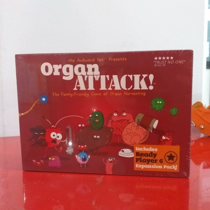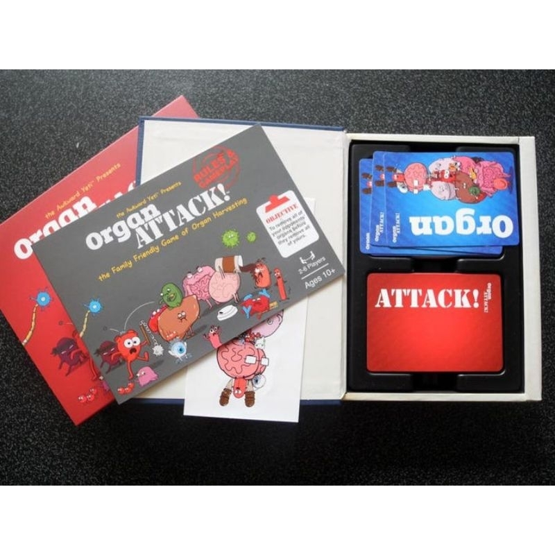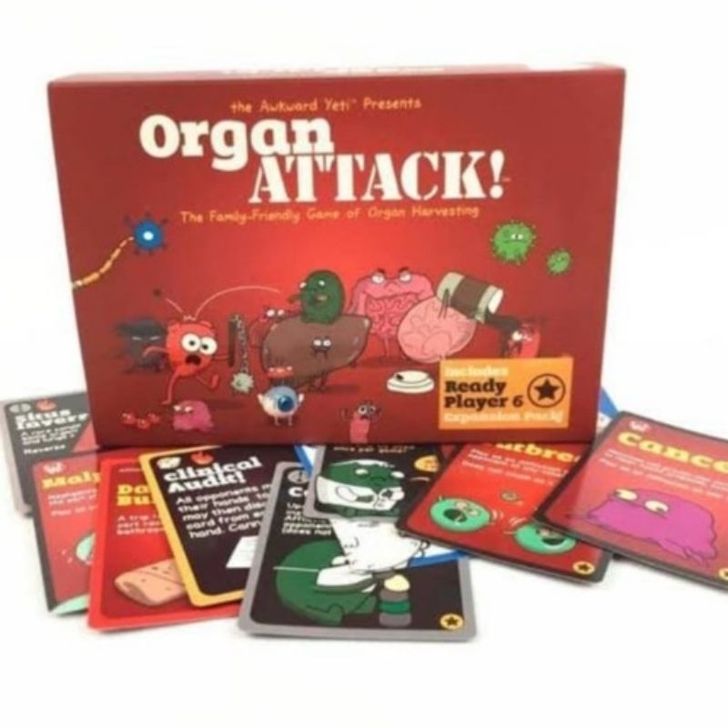 Organ ATTACK! blends medically accurate terminology with immature potty humor. In the game, each player is dealt a set of organs. The players use immunity, affliction, and other tactical cards to protect themselves while inflicting disease & bodily harm on their opponents. For example:
