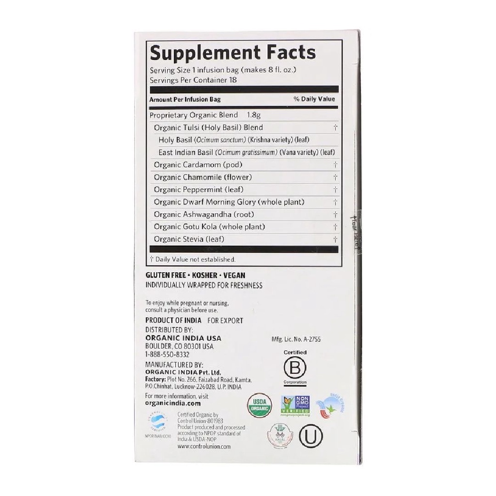 BENEFITS Tulsi: India's beloved Queen of Herbs for 5,000 years. Adaptogenic Tulsi supports a healthy stress response. Ayurvedic Ashwaghanda to restore and calm. Caffeine Free | Gluten Free