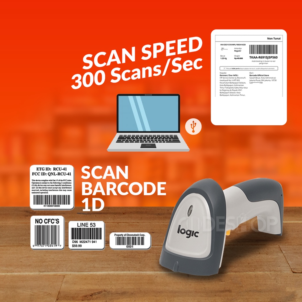 Spesifikasi Logic LS-30: - Scan Mode: Trigger Continous - Light Source: 650 nm visible Laser diode - Scan Pattern: Single line - Scan rate: 300 Scans/Sec - Bit error rate: 1,5 millions - Resolution: -+ 3mil - Depth of field: 5-650 mm - Elevation: 60 Derajat - Obliquity: 45 Derajat - Interface supported: USB - Laser Safety: IEC 60825-1 Standard Class 2 for laser products - Decode capability: UPC-A, UPC-E, Industrial 2 of 5, interleaved 2 of 5, EAN 8, EAN 13, CODE 128, EAN 128, CODE 39, CODE 93, Codabar 125, MSI/Plesset, Etc. - Operating Temperature: -15c - 45c - Storage temperature: -25c - 55c - Drop test: 1,5m - Power: DC 5V -+5% 75 mA - Material: ABS + PC