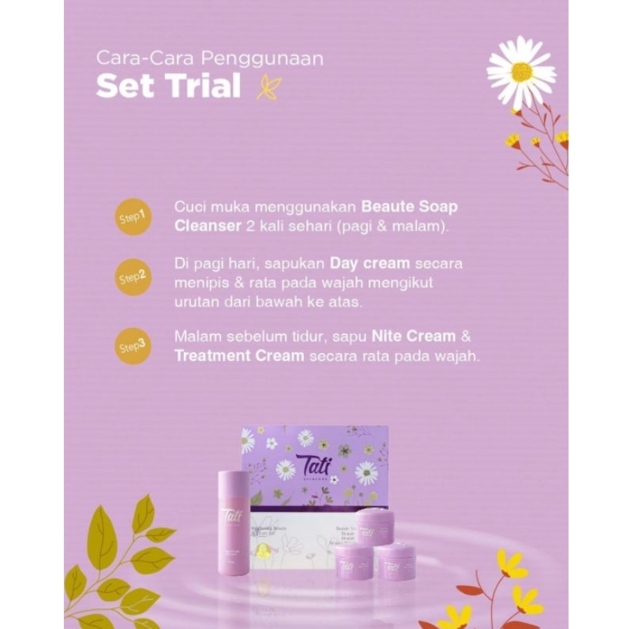 1Paket TATI SKINCARE Terdiri Dari : - Beaute Soap Cleanser (60ml) - Beaute Day Cream (5gm) - Beaute Night Cream (5gm) - Beaute Treatment Cream (5gm) .