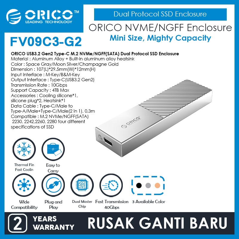 1. Product Model : ORICO-FV09C3-G2 2. Material : Aluminum Alloy + Built-in aluminum alloy heatsink 3. Color : Space Gray/Moon Silver/Champagne Gold 4. Dimension : 107(L)*29.5mm(W)*12mm(H) 5. Input Interface : M-Key/B&M-Key 6. Output Interface : Type-C(USB3.2 Gen2) 7. Transmission Rate : 10Gbps 8. Installation : fixed by screws 9. Support Capacity : 4TB Max 10. Accessories : Cooling silicone*1, silicone plug*2, Heatsink*1 11. Supported System : Windows/Mac OS/Linux 12. Data Cable : Type-C/Male to Type-A/Male+Type-C/Male(2 in 1), 0.3m 13. LED indicator : monitor state of the SSD 14. Compatible : M.2 NVMe/NGFF(SATA) 2230, 2242, 2260, 2280 four different specifications of SSD 15. Support : NVMe/NGFF(SATA) dual protocol and UASP acceleration protocol 16. Compatible with : PC, laptop, smart TV, smart router, PS4 and other devices 17. Support : enter sleep state after 10 minutes of idle time