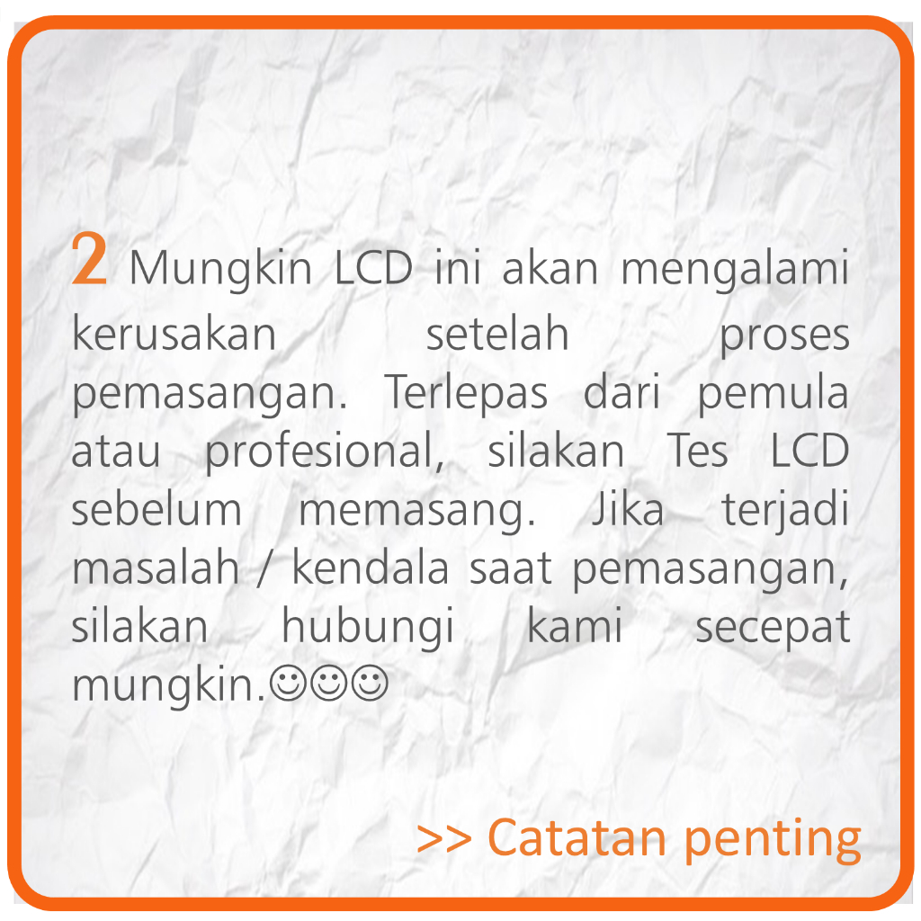 LCD yang kami jual telah lulus Quality Control & telah dilakukan pengujian secara fisik untuk menentukan tingkat presisi serta fungsi. Harap untuk memastikan model LCD / merk HP agar sesuai dengan yang dibutuhkan.