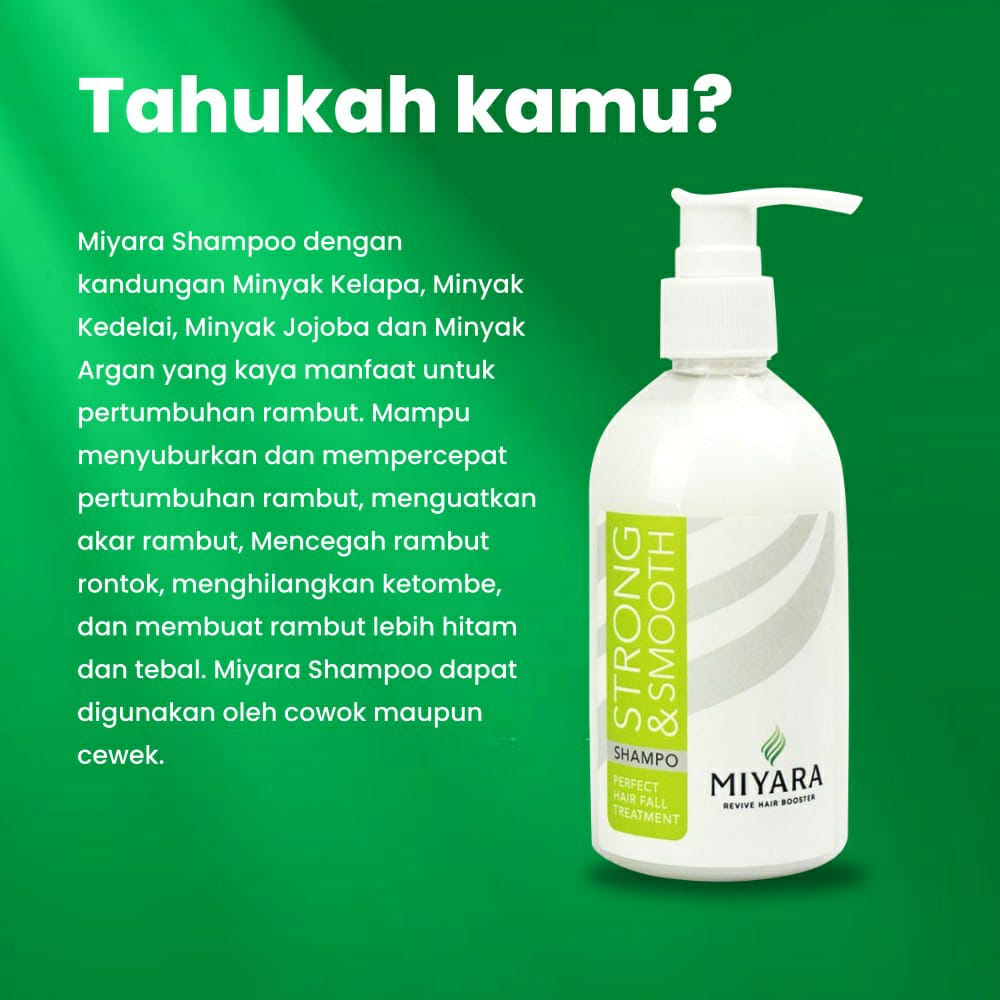 miyara shampoo alami dengan kandungan minyak kelapa ,minyak kedelai, minyak jejoba, dan minyak argan yang kaya manfaat untuk pertumbuhan rambut. mampu menyuburkan dan mempercepat pertumbuhan rambut, menguatkan akar rambut, mencegah rambut rontok, menghilangkan ketombe, dan membuat rambut lebih tebal dan hitam.