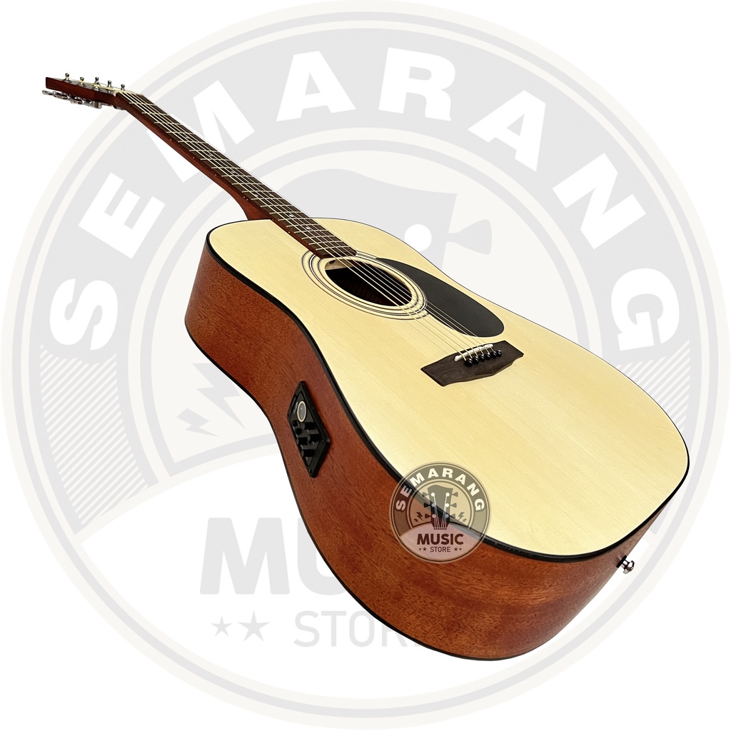 CONSTRUCTION: Dovetail Neck Joint. BODY: Dreadnought. TOP: Spruce Top. BACK AND Sides: Mahogany Back and Sides. NECK: Mahogany C Shape. BINDING: Black Line. FRETBOARD: Rosewood. SCALE: 25.5" (647.7mm). INLAY: White Dot. BRIDGE: Rosewood / Scooped. TUNERS: Die-cast Chrome. ELECTRONICS: Cort CE304T Ceramic Pickup. ROSETTE: Multiple B/W Printing. STRINGS: D'Addario USA. BRACING: X-Bracing. FINISH: Natural Satin.