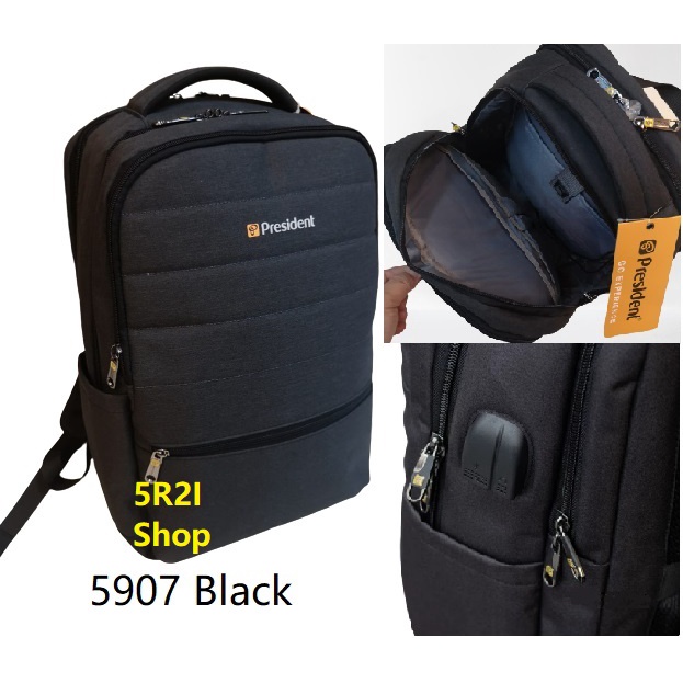 ORIGINAL PRESIDENT BACKPACK with USB charging Port 2 Type: 5907 / 5906 Elegant president backpack suited for office work and student. Size: T.45 x L.29 x 15 cm 3 zipper main compartment backpack with 1 front pocket zipper Fit up to 15,6 inch with padded Laptop 2 left-right pock 1 ongoing USB port Raincoat to cover from dust/wet Back Slip for luggage handle