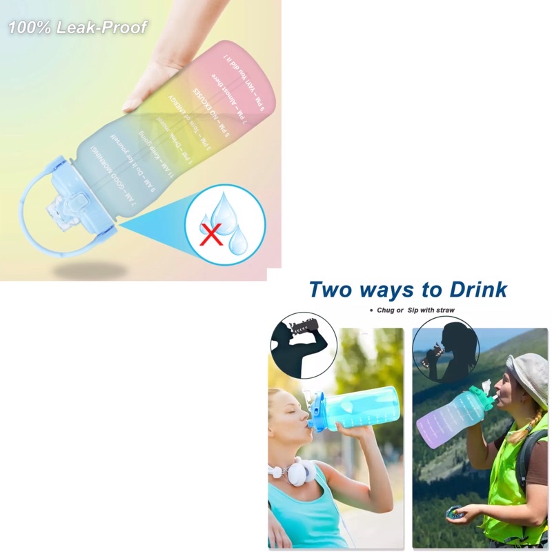 Merek: QuiFit Yang Didapat: 1 botol + 1 Sedotan. Kapasitas Botol: 2L / 64OZ Dimensi Botol: 14X31,5cm / 5,5 inci X 12,4 inci Bahan Botol: 100% BPA FREE, Tritan, Ramah Lingkungan, Dan Tahan Lama, Anti Bocor Mulut Botol: Pengunci Tutup Flip-Flop Dengan Sedotan Pegangan: Dipegangan Bisa Buat Dudukan Smartphone