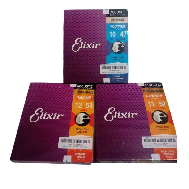 Deskripsi : * Senar gitar akustik elixir Polyweb dan Nanoweb merupakan senar anti karat yg menghasilkan suara yg bagus dan empuk saat di mainkan. * Polyweb : Suara yg dihasilkan berkarakter lembut enak untuk di mainkan lebih licin dan empuk, cocok untuk yg suka bermain gitar cepat ( Petik/Fingerstyle ). Cocok untuk lagu pelan sampai menengah seperti lagu Slow, Pop, Dll * Nanoweb : Suara yg dihasilkan berkarakter keras enak dimainkan, namun tidak se empuk yg Polyweb. Tetapi suara lebih keluar di banding Polyweb, cocok untuk yg menginginkan suara gitarnya lebih keluar. Cocok untuk lagu menengah sampai keras seperti lagu Pop, Jazz, Rock, Metal, Dll ( Strumming/Genjreng ).