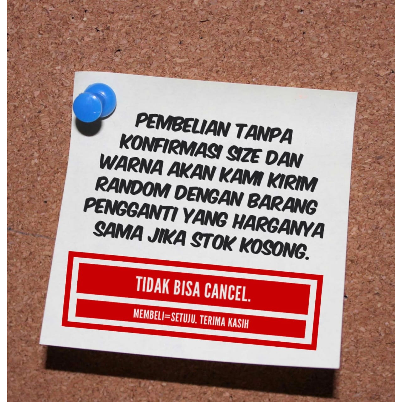 Pembelian tanpa konfirmasi akan kami kirim random dengan barang pengganti yang harganya sama jika stok kosong.