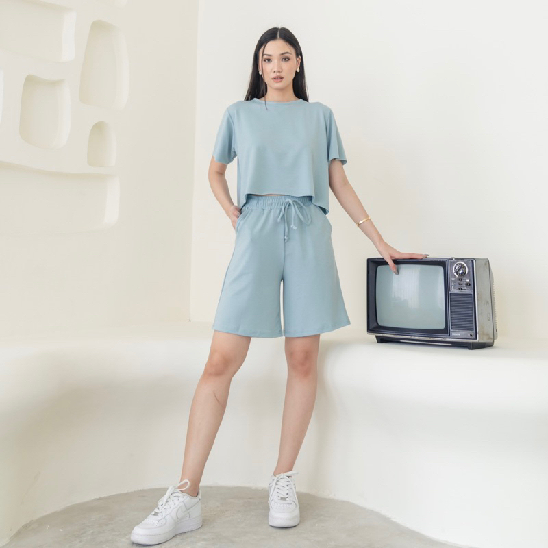 ALL SIZE TOP: bust fit to 112cm, length 43cm PANTS: waist 64cm (stretch to 96cm), hip 104cm, length 49cm [REGULAR FIT]