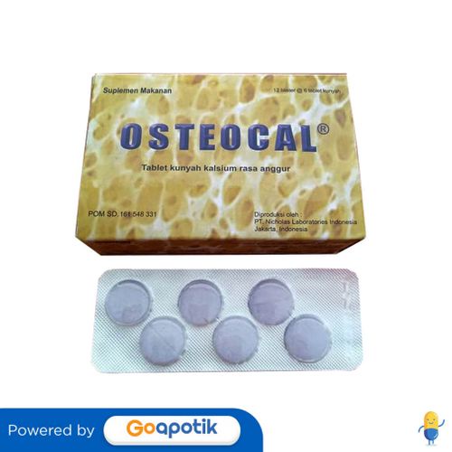 Deskripsi : Osteocal mengandung Ca carbonate yang merupakan suplemen yang dapat digunakan untuk terapi gangguan metabolisme, defisiensi kalsium, serta membantu memenuhi kebutuhan vitamin dan mineral. | Komposisi : Tiap tablet mengandung Ca carbonate 1250 mg | Dosis : Diminum 1 kali sehari 1-2 tablet | Indikasi : Untuk terapi gangguan metabolisme, defisiensi kalsium, serta membantu memenuhi kebutuhan vitamin dan mineral. | Perhatian Khusus : Alergi, pasien dengan penyakit autoimun, osteoporosis, hipokalsemua, gangguan kelenjar paratiroid, gangguan keseimbangan hormon, dan hipotensi | Kemasan : Dus, 12 blister @ 6 tablet kunyah | NIE : SD161548331