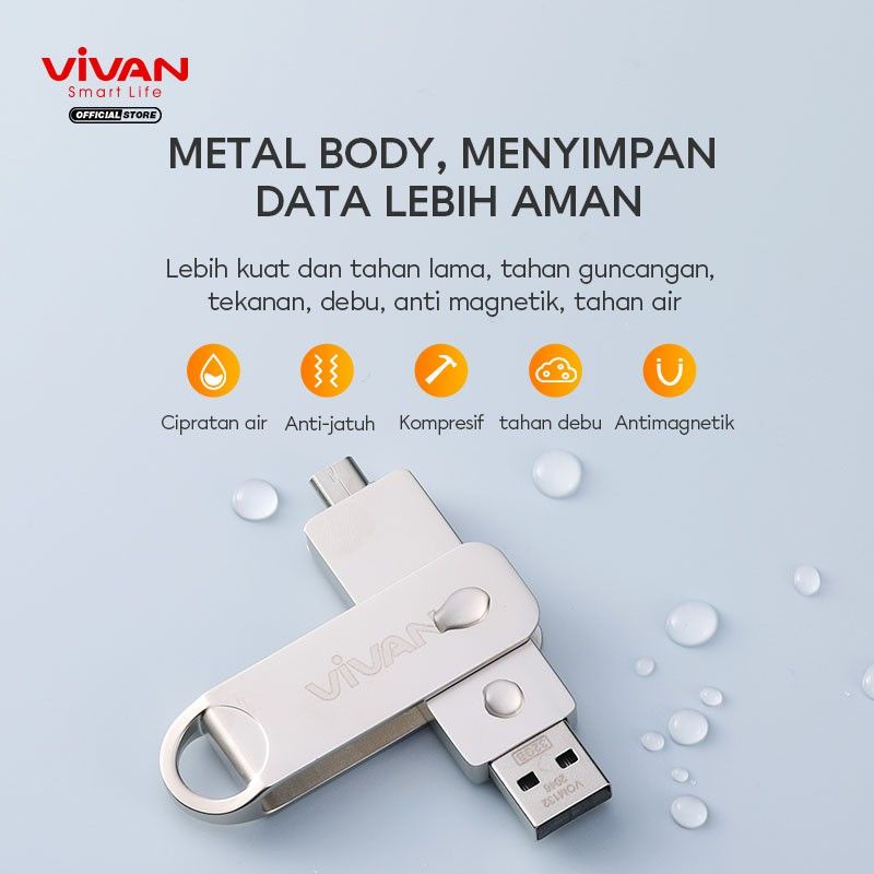 OTG Flashdisk 32GB Vivan VOM132 Dual Interface Micro to USB 2.0 Metal Body Keunggulan: 1. Kapasitas 32GB, sebagai solusi ringkas saat internal memori smartphone-mu kepenuhan. 2. Dual interface (Micro USB + USB-A). Dapat digunakan untuk memindahkan file dari komputer/laptop ke flashdisk seperti fungsi flashdisk pada umumnya atau dapat pula digunakan sebagai media pemindahan/penyimpanan file eksternal dari smartphone. 3. Dibekali material metal body untuk menghasilkan karakter flashdisk yang kuat, tahan lama, tahan air, tahan tekanan, tahan debu dan anti magnetik. 4. Hadir eksklusif dengan desain rotasi locking 90°, putaran 360° dan celah gantungan kunci yang fleksibel.